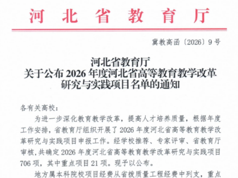 文章导读:日前,河北省教育厅下发了《关于公布2026年度河北省高等教育教学改革研究与实践项目名单的通知》(冀教高函〔2026〕9号),我校申报的5项教改项目获得省厅全部立项。具体如下:自2025年11月河北省教育厅启动本轮教改项目申......